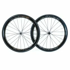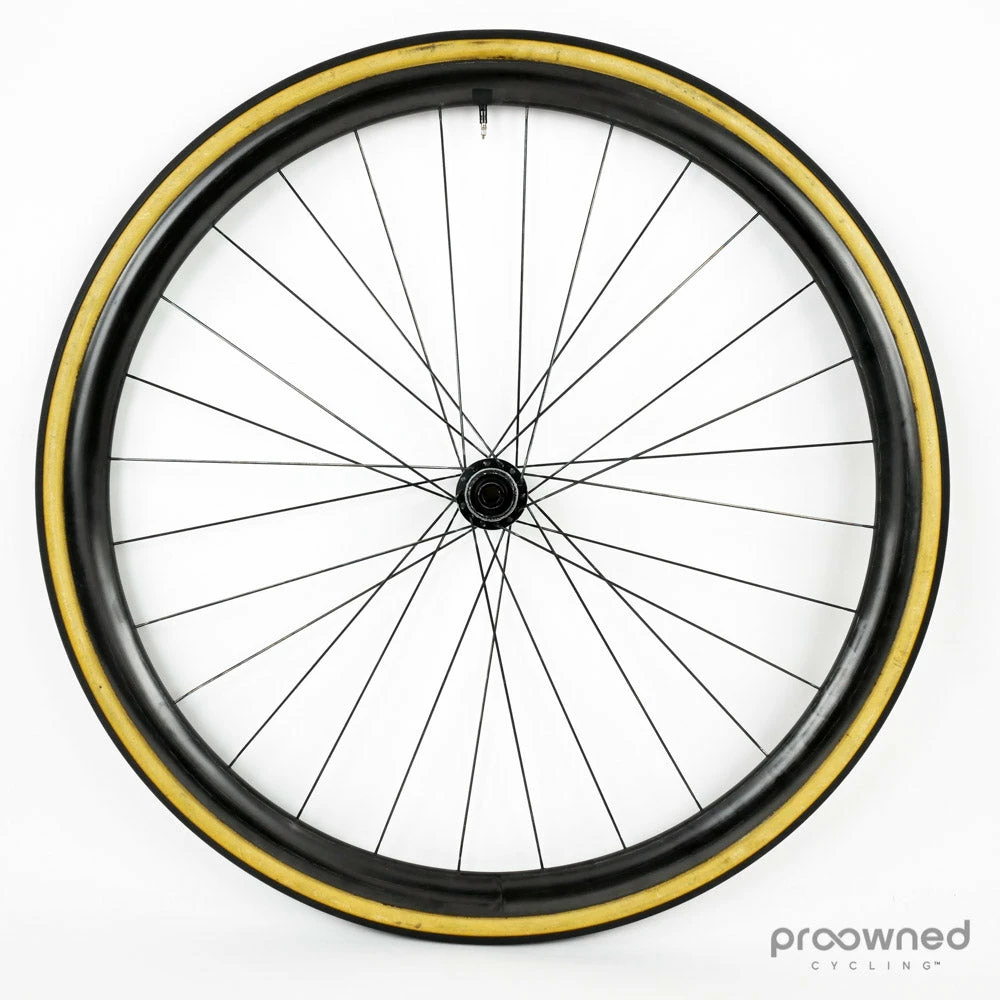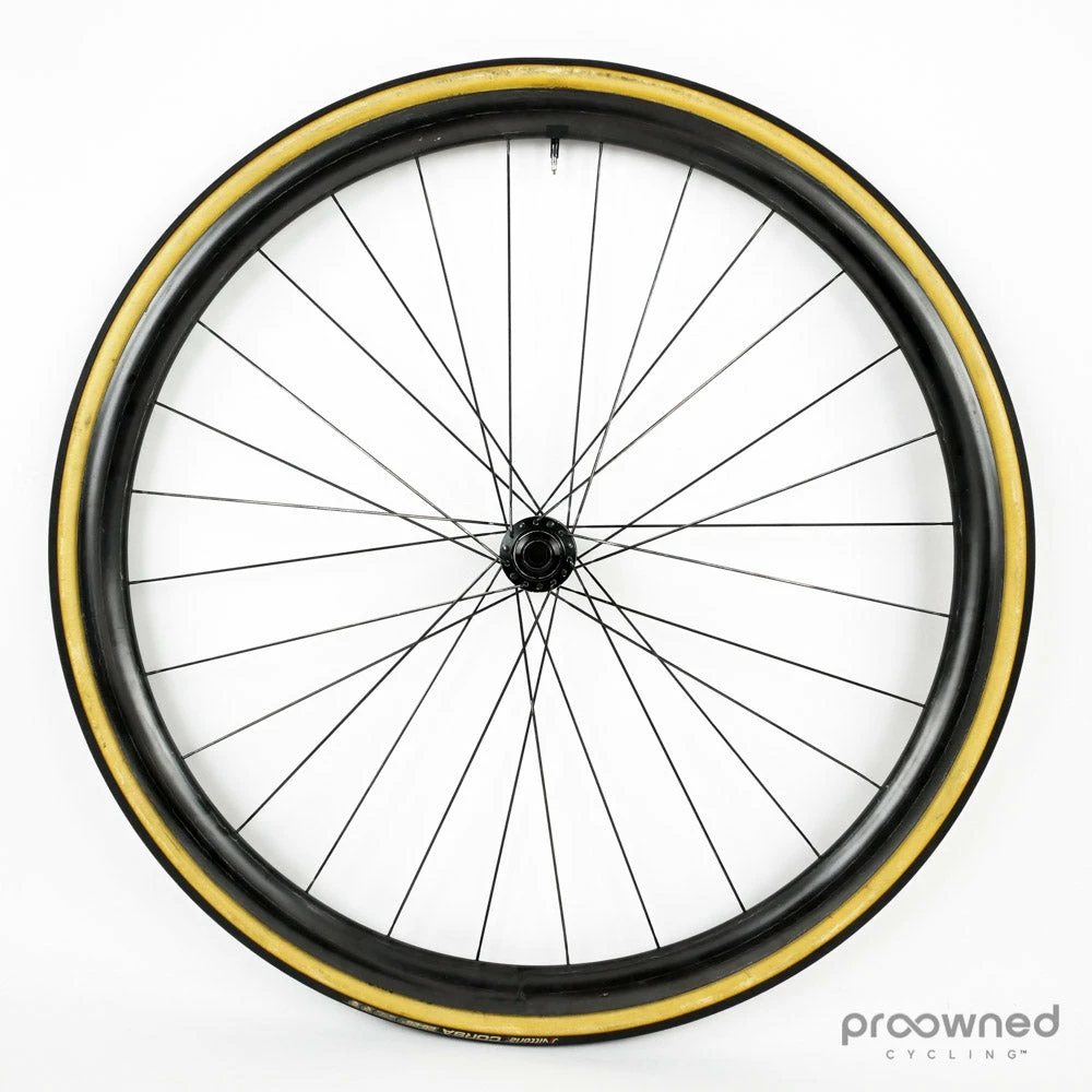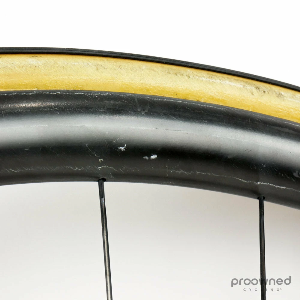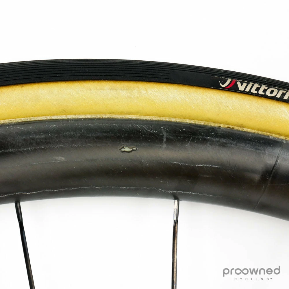 The wheel is used but only shows a few minor cosmetic scratches, nothing that affects the performance of the wheel. The wheel is equipped with a Vittoria Corsa tire. The tire is used but in good condition.