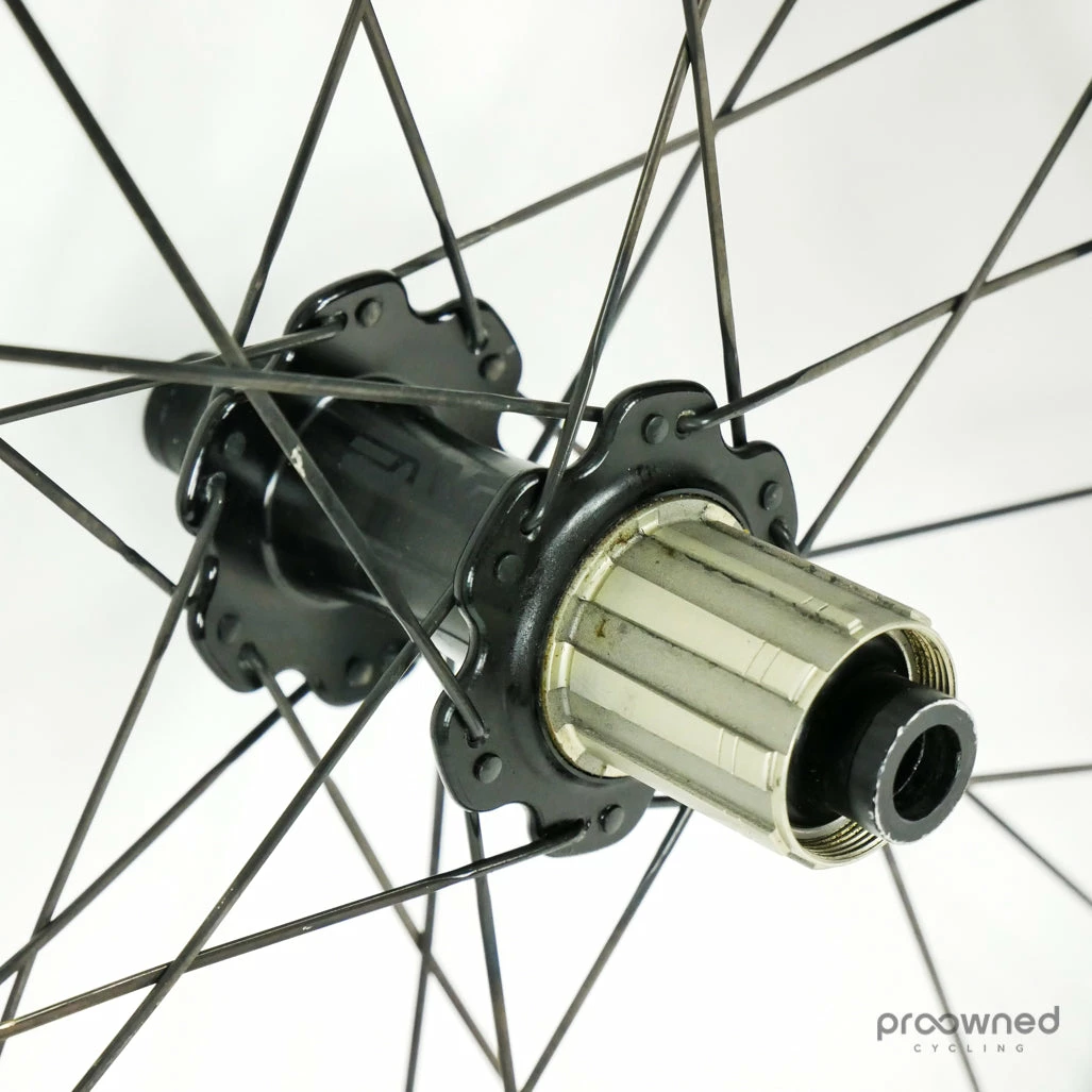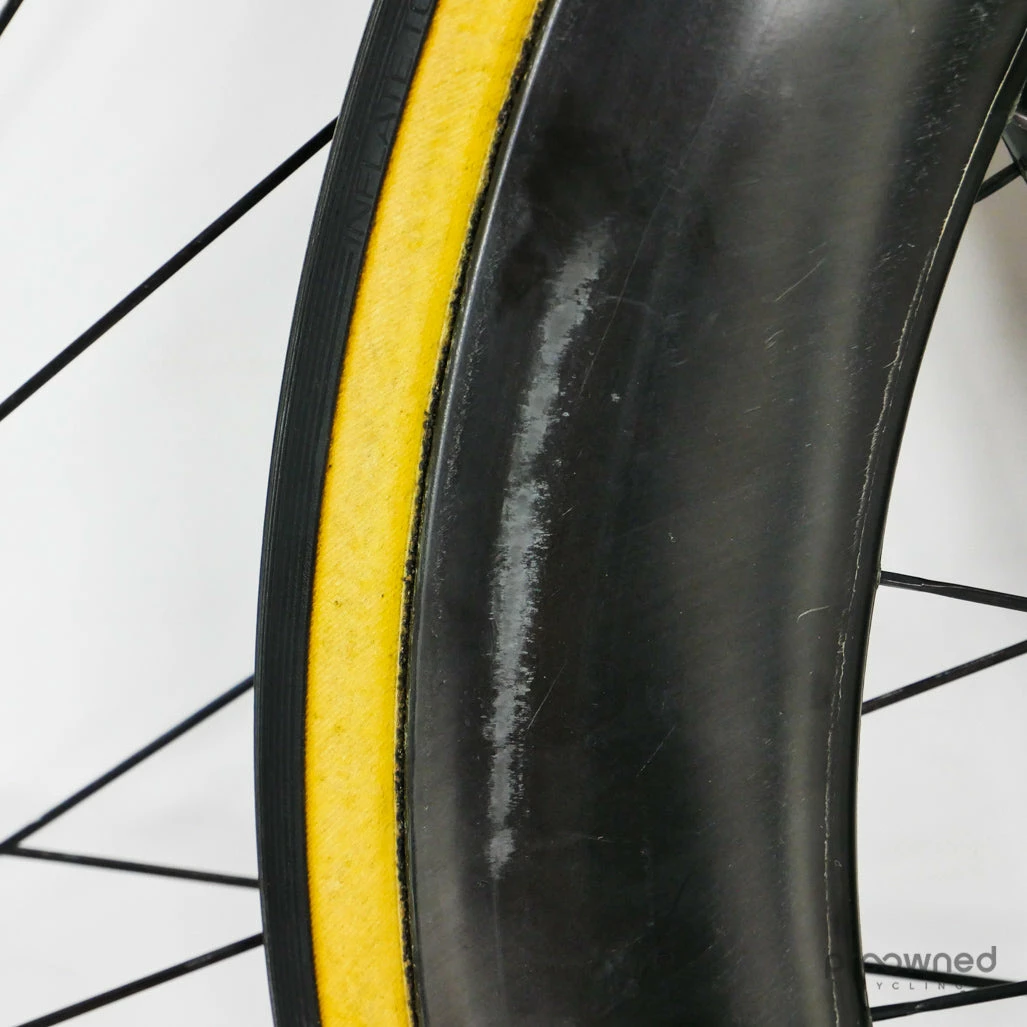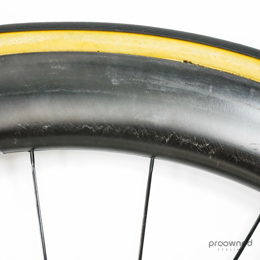 The wheelset is used but only shows a few minor cosmetic scratches, nothing that affects the performance of the wheel. The wheelset is equipped with a pair of Vittoria Corsa Graphene 25mm tires. The tires are used but in good condition.