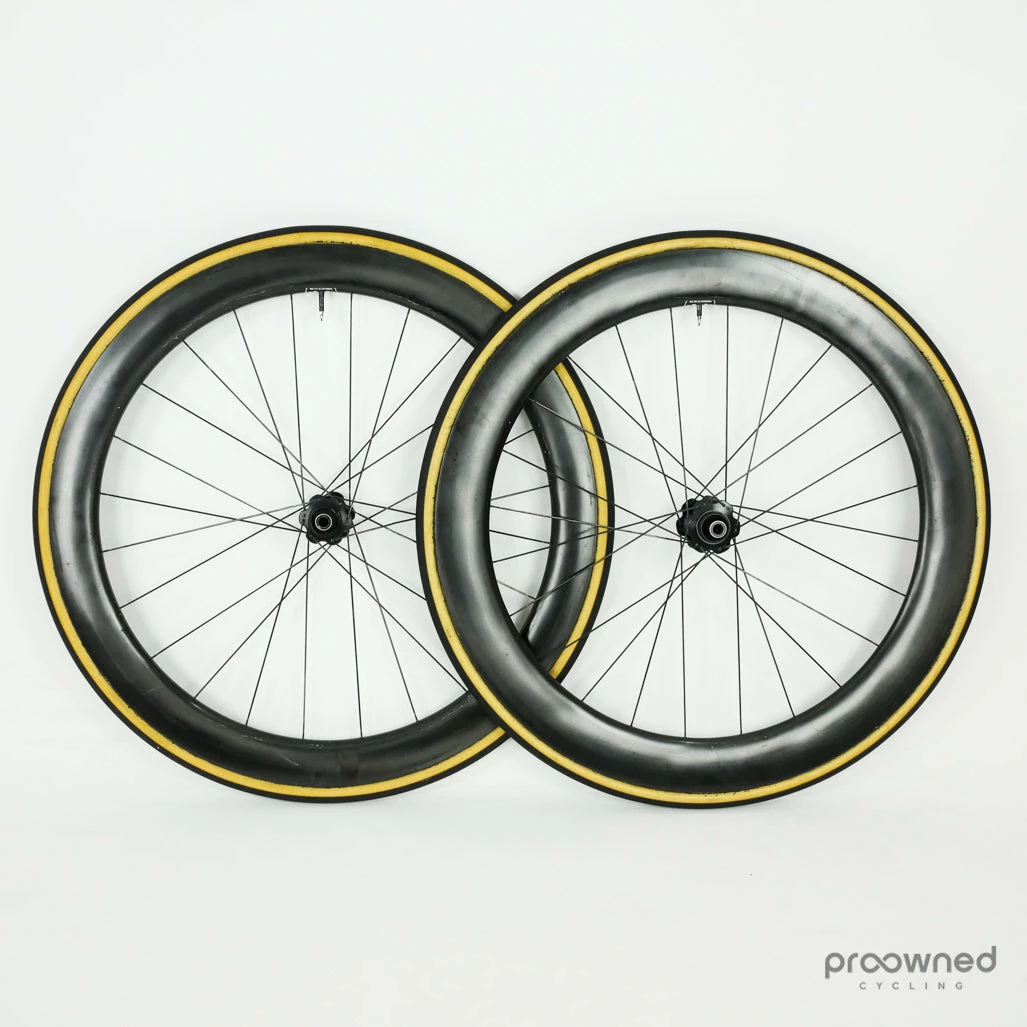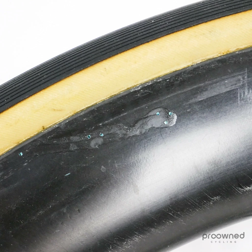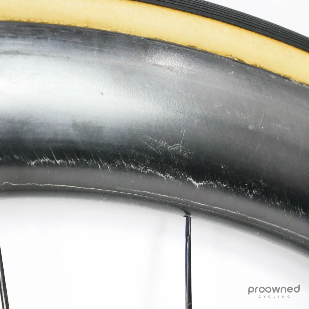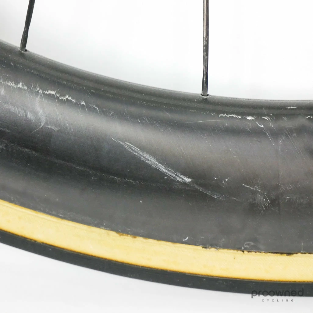 The wheel is used but only shows a few minor cosmetic scratches, nothing that affects the performance of the wheel. The wheelset is equipped with a pair of Vittoria Corsa Graphene 25mm tires. The tires are used but in good condition.
