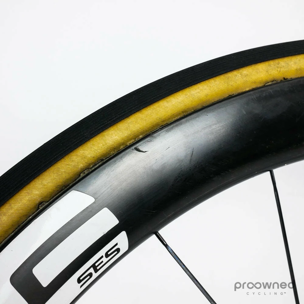The rear tubular tire has been mounted and used but is in overall good condition.