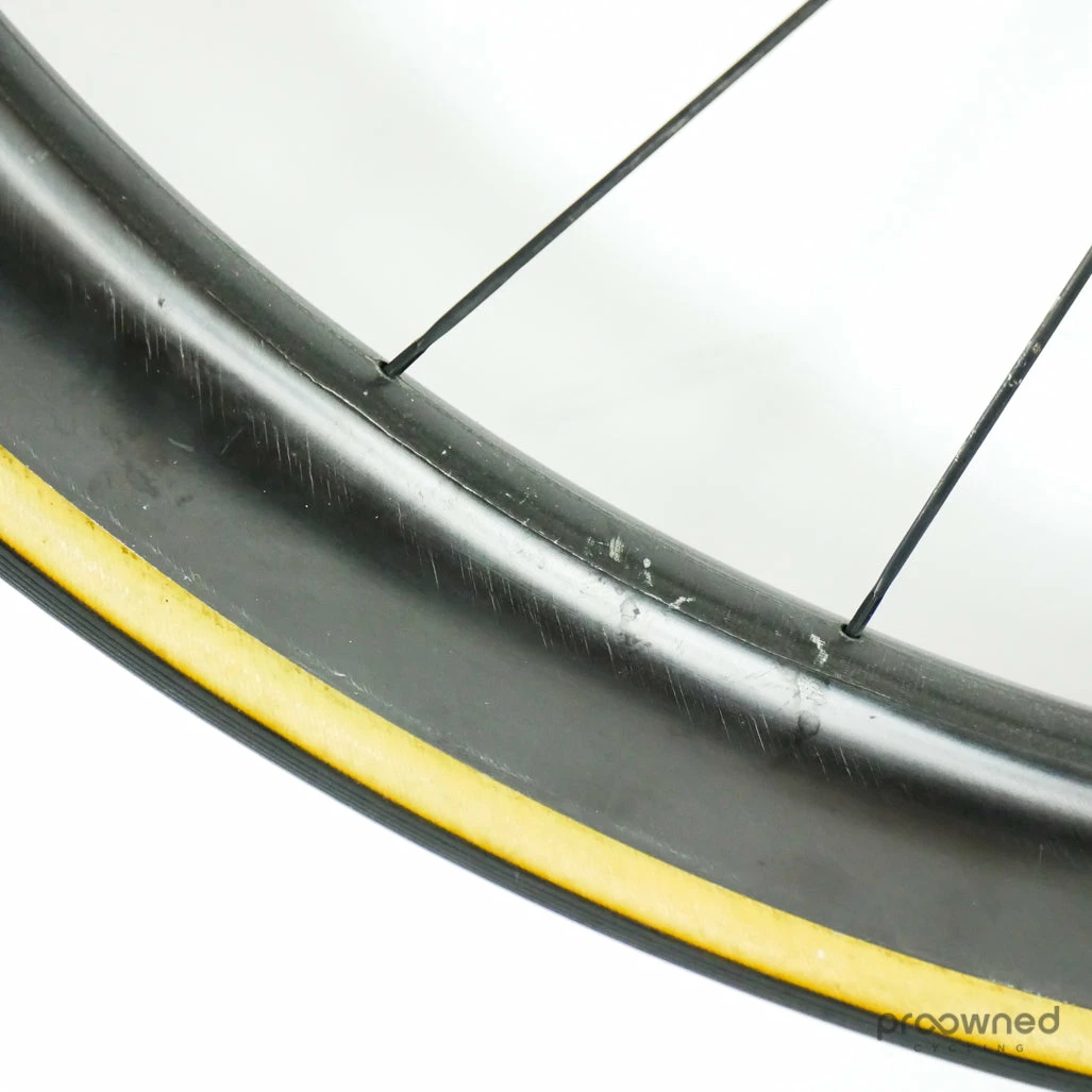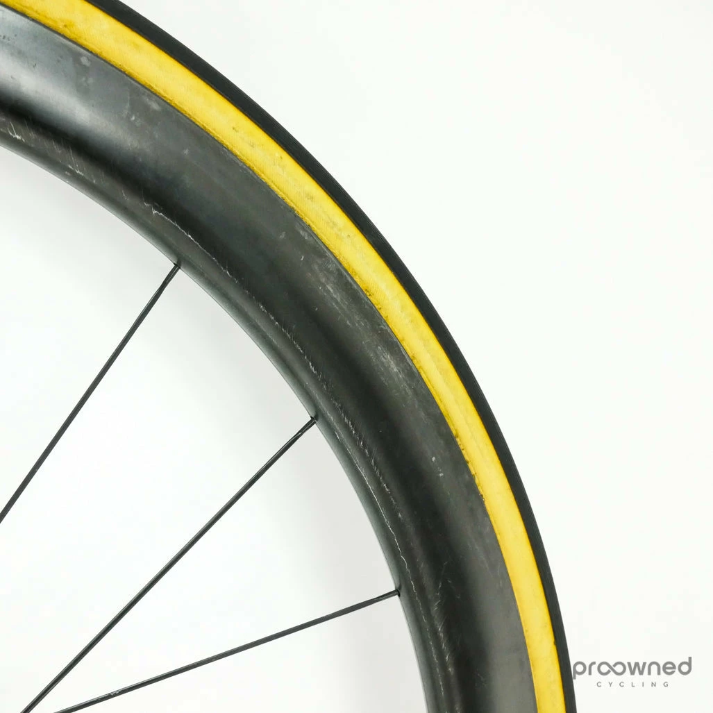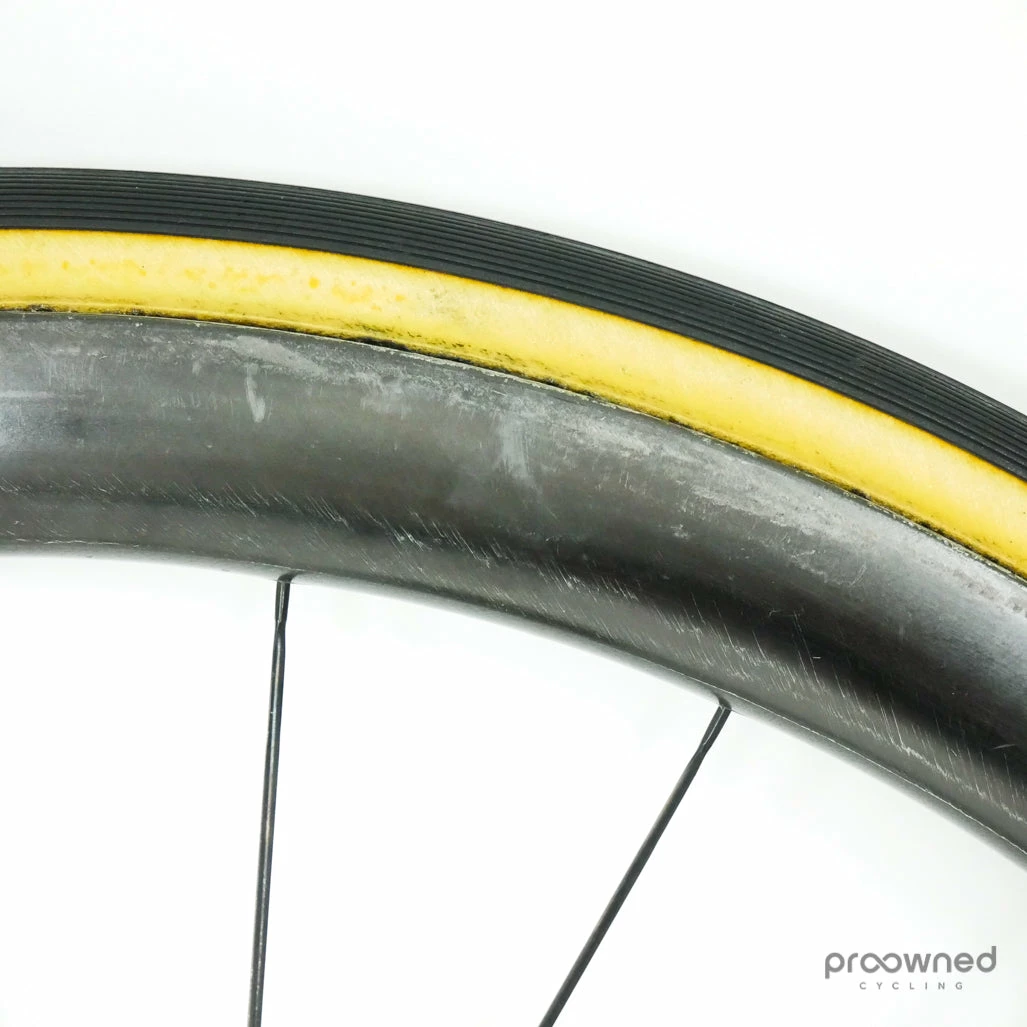 The wheels are equipped with a pair of Vittoria Corsa Graphene 2.0 tires. The tires are used but in good condition and are ready for many more miles of racing.