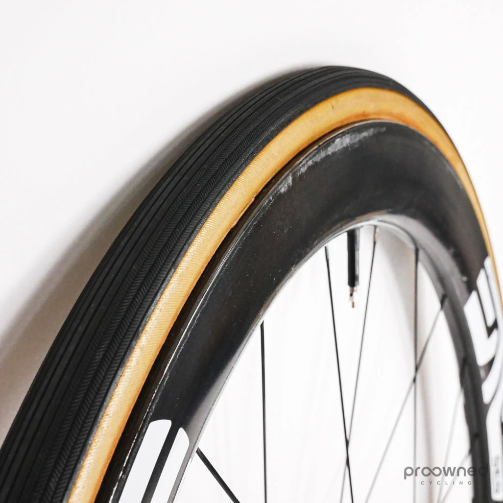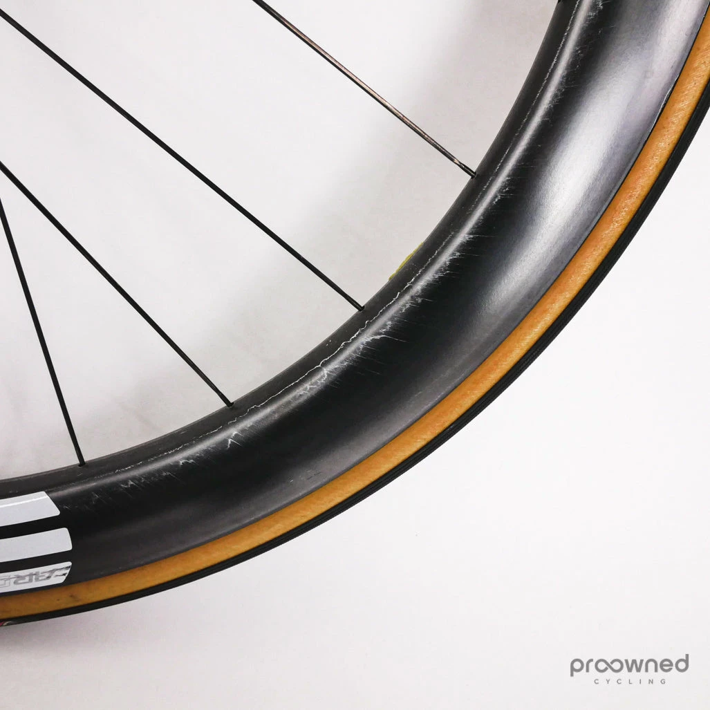 The wheelset is equipped with a combination of Vittoria Corsa Graphene 2.0 and Corsa Control tires. The tires are used but in good condition.