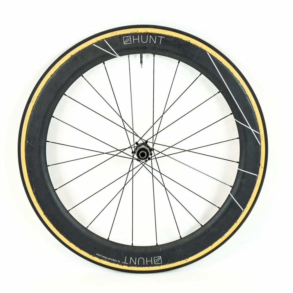 HUNT 45 Team Issue disc rear wheel in Carbon with a tubular tire.