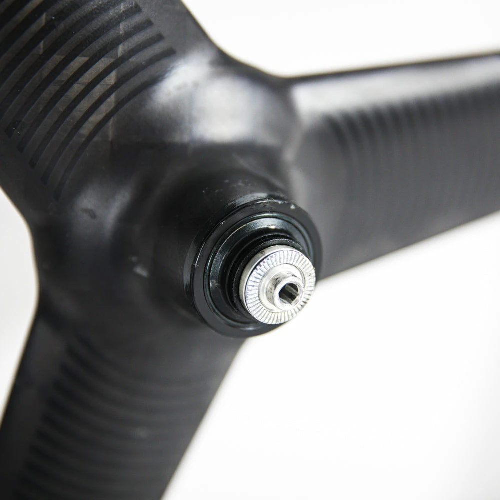The wheel delivers reliable and smooth performance in varied conditions and can with great advantage be combined with a disc wheel, to complete an incredibly fast time trial machine. The spread tow carbon fibre construction not only looks awesome, but it is also extremely stiff and lightweight, ensuring a very low weight. The design provides minimal drag due to the 3-spoke profile, resulting in a phenomenal performance at high speeds. To prevent interrupting the airflow the valve is positioned behind one of the spokes.
