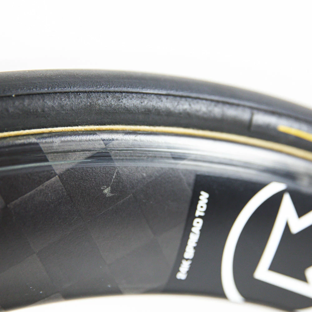 This wheel comes with a Pirelli P Zero Velo tubular tire mounted by the team mechanics. The race-ready lightweight tire is a fast and durable choice and offers great puncture protection as well as speed. The P Zero Velo is made for racing with low rolling resistance making it perfect for Granfondo raced and shorter high-speed racing.