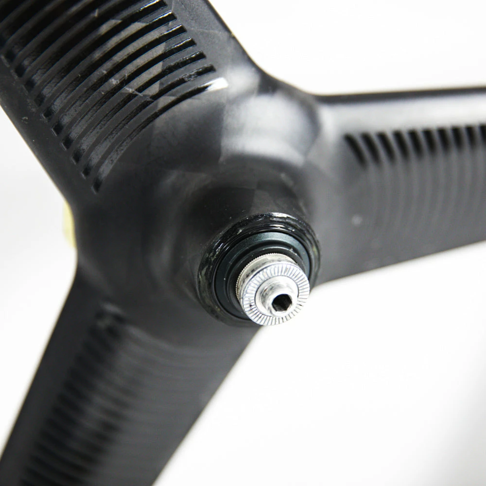 The wheel delivers reliable and smooth performance in varied conditions and can with great advantage be combined with a disc wheel, to complete an incredibly fast time trial machine. The spread tow carbon fibre construction not only looks awesome, but it is also extremely stiff and lightweight, ensuring a very low weight. The design provides minimal drag due to the 3-spoke profile, resulting in a phenomenal performance at high speeds. To prevent interrupting the airflow the valve is positioned behind one of the spokes.