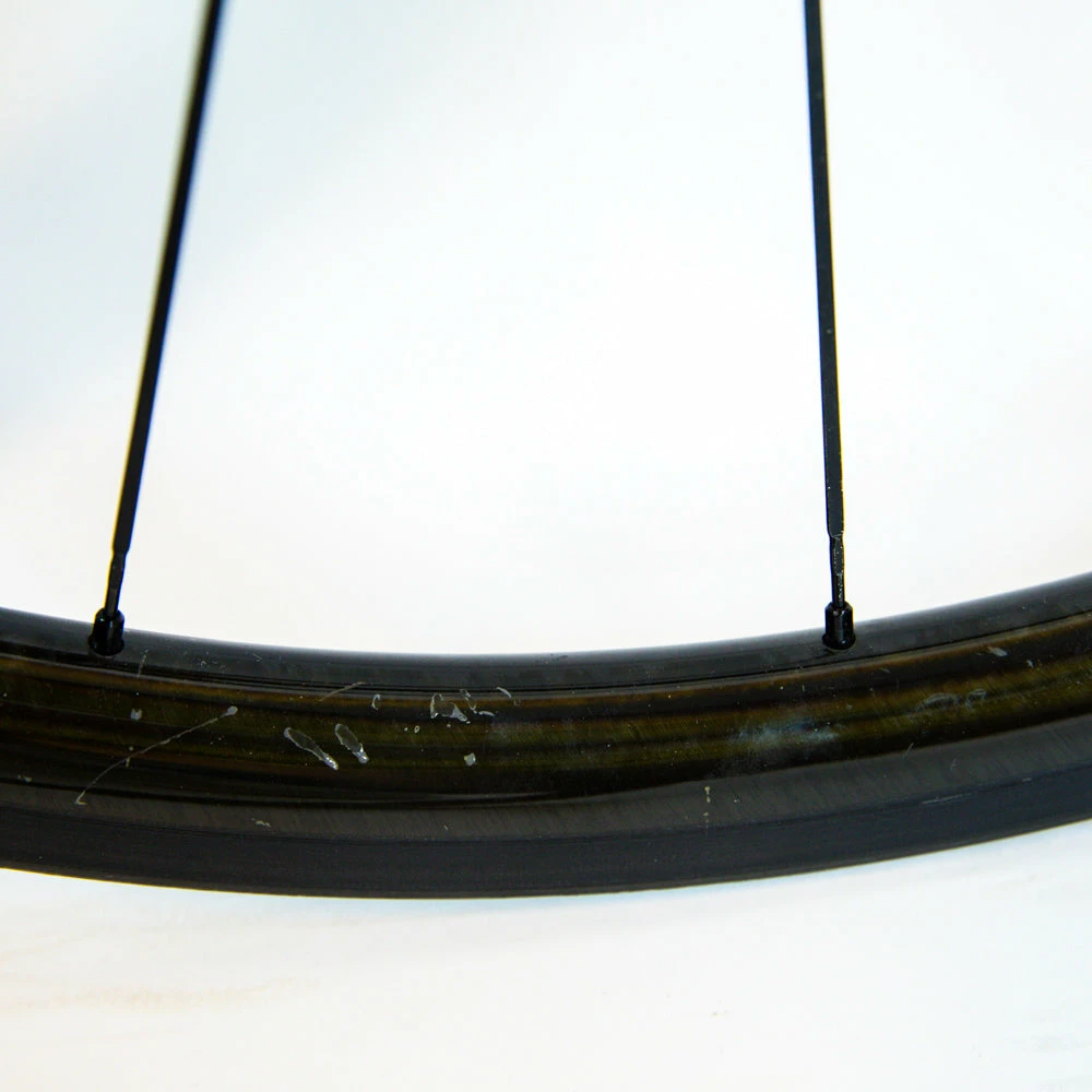 The wheelset is used. It comes with some marks and glue residue from usage (mostly clearcoat). The wheels are in good condition with some scratches. The bearings are in a decent condition and still have miles left in them.