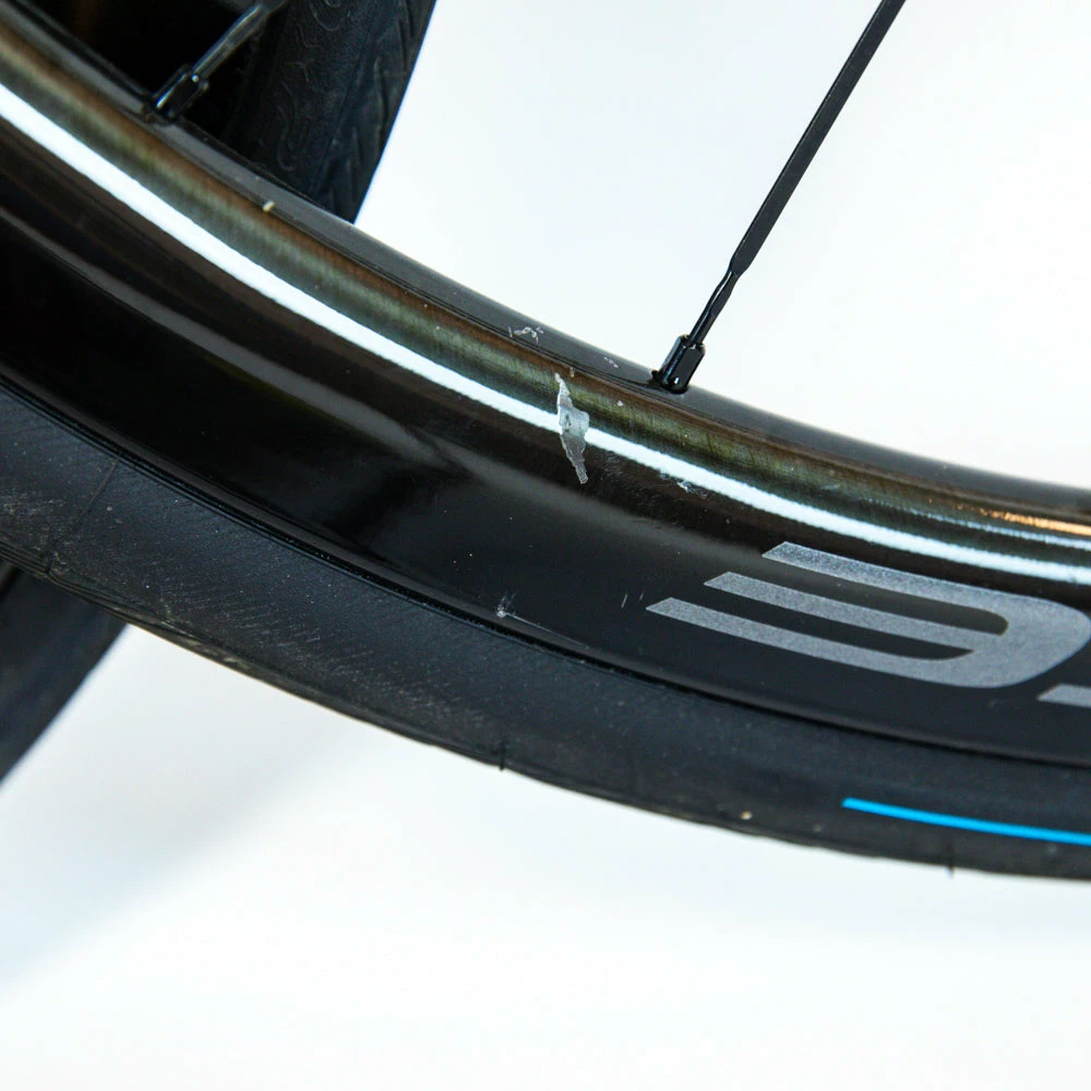 The wheelset is used. It comes with few marks from usage (small marks in clearcoat). The wheels are in good condition with few scratches. The bearings are in a decent condition and still have miles left in them. The front tire is as new and the rear tire is used.
